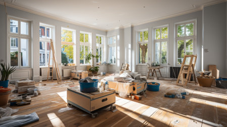 A bright spacious empty apartment ready for professional renovation. Home during renovation, decoration and painting. Interior apartment improvement maintenance. Work tables, cases and ladders