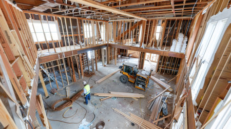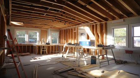 This image shows a room being remodeled with exposed ceiling beams, ladders, and construction materials scattered around. Ideal for articles about home renovation and remodeling.