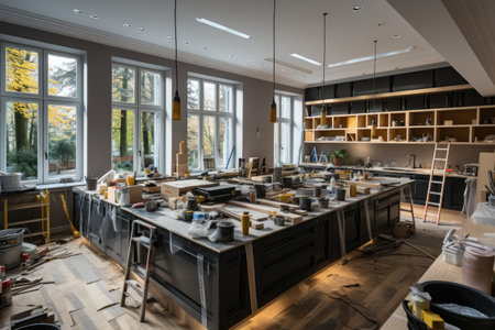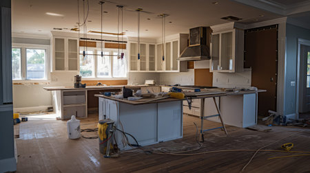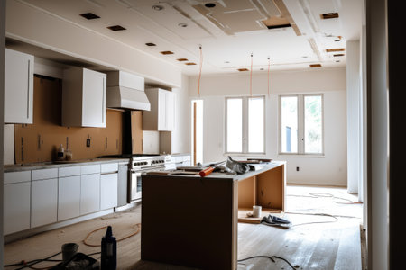 Spacious Kitchen With Numerous Cabinets for Efficient Storage, Preparing kitchen for installation of custom new features in modern home improvement, AI Generated