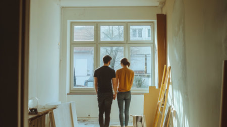 Couple exploring potential home renovation in empty room with large windows
