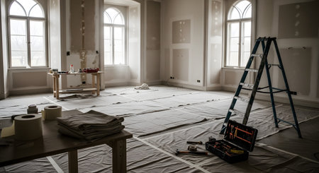 An empty room with high ceilings and large arched windows is undergoing renovation. Drop cloths cover the floor, and a ladder, toolbox, and painting supplies are scattered around, depicting the process of home improvement.