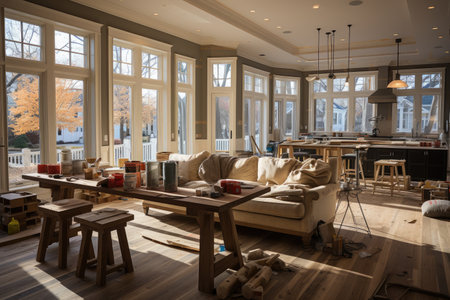 This room features a multitude of generously sized windows, allowing an ample amount of natural light to illuminate the space, General contractor inside a modern building house, AI Generated