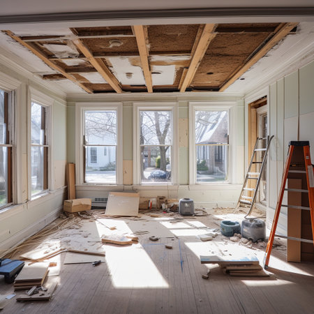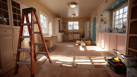 Construction work is underway with a ladder and various tools present highlighting the effort to renovate the interior of the house.