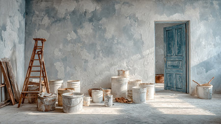 Sunlit empty room featuring a variety of paint buckets and a wooden ladder beside an open door, showcasing a blend of textures and colors.