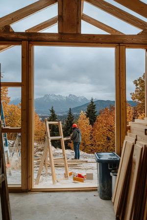 Building a Dream Home Construction Worker Amidst Wooden Frame, Mountains in Distance