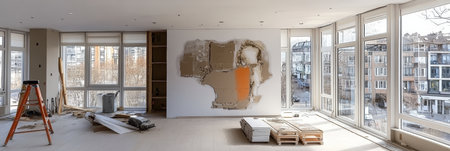 Living room in an apartment undergoing renovation features messy walls, rubble scattered across the floor, and tools everywhere, with bright sunlight streaming in from large windows.