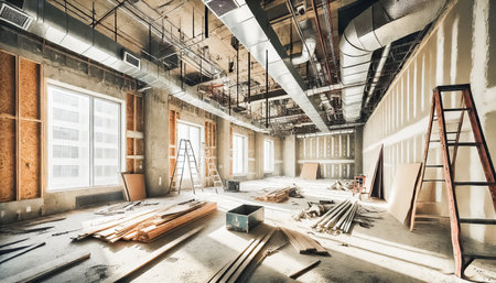 A spacious room under construction, featuring exposed ceiling ducts and electrical wiring. Drywall is nearly completed, with scattered wooden planks, buckets, and tools across the dusty floor. Sunlight streams through large windows, casting shadows on the unfinished walls. Ladders and drywall sheets lean against the walls, emphasizing the raw, industrial atmosphere of the ongoing renovation work.