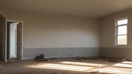 Room interior showing construction and home improvement project, with unfinished walls, plaster dust, scattered wood planks, paint cans, and sunlight on the floor, ready for completion