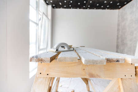 Wooden board in room and construction tools are in an apartment during on the construction, remodeling, rebuilding and renovation.