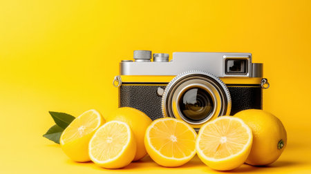 A retro yellow camera with fresh lemons on a vivid yellow background. AI-generated.