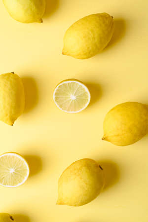 Juicy lemons on a bright yellow background, citrus minimal concept. Flat lay, top view, copy space.