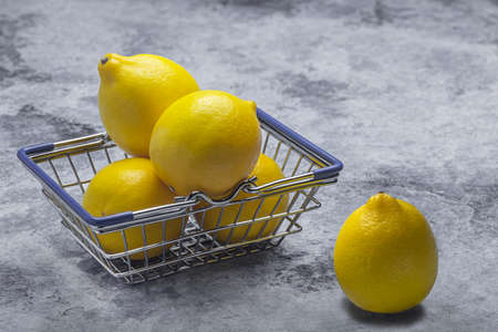 ripe lemons on gray background. Fresh juicy lemons as summer cocktails and lemonade ingredient, harvest concept. top view, flat lay, copy space for text