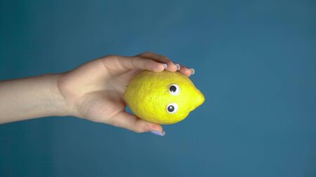 Lemon with eyes in a woman hand close up on a blue background. Vertical photo.