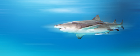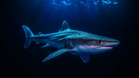 A shark swims in the deep blue sea, its streamlined body and powerful tail propelling it through the water, embodying the strength and grace of marine life.