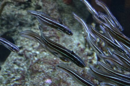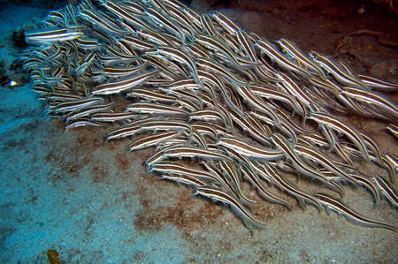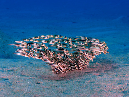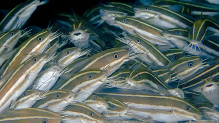 A school of Striped eel catfish, Plotosus lineatus, feeds on planktonic organisms on the sandy seafloor, This species has venomous spines that are used for defensive purposes.