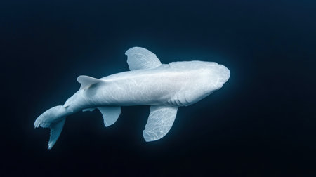 A breathtaking image of a white shark gliding elegantly through the dark depths of the ocean, showcasing the beauty and grace of marine life.