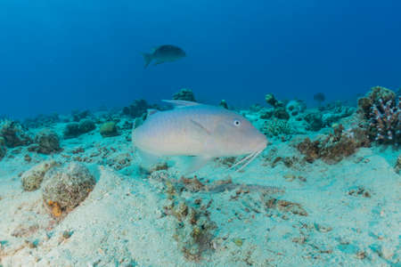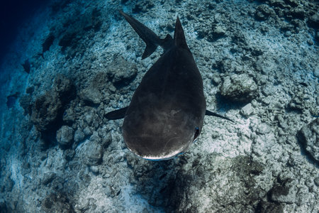 Picture shows a Tiger shark at the bottom of a tropical sea.