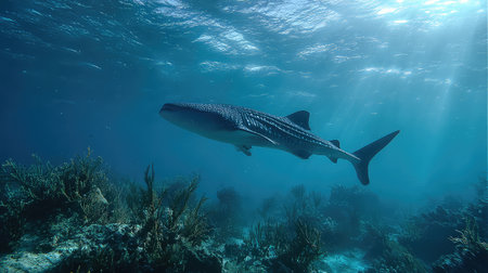 Experience the serene beauty of an ocean scene featuring a whale shark gracefully swimming through clear waters, illuminated by sunlight above.