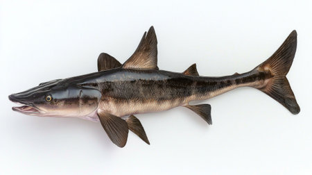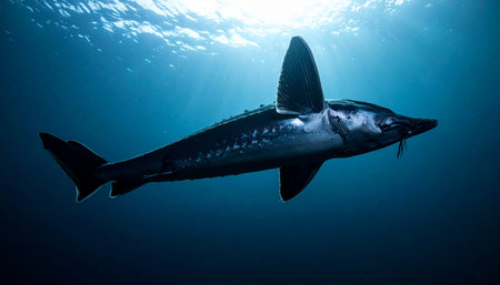 A magnificent sturgeon, a living relic from a prehistoric era, glides silently through the deep blue water. Sunlight from the surface illuminates its powerful silhouette, creating a scene of majestic tranquility and wild, untamed nature.