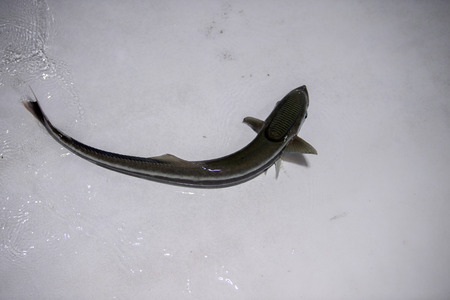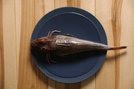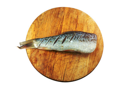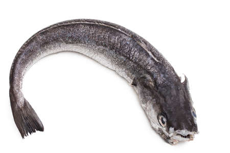 Raw icefish on a kitchen table. White background. Top view. Copy space