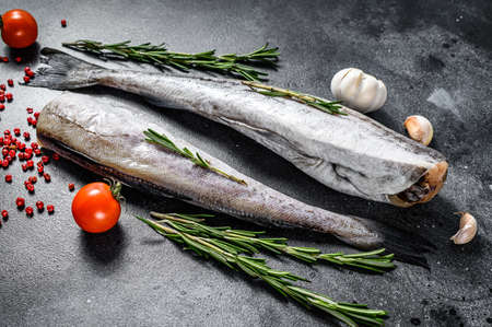 Raw Pollock fish with rosemary and pink pepper. Organic seafood. Black background. Top view.