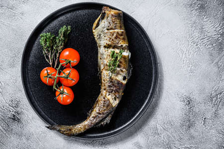 Delicious grilled hake with fresh thyme and tomatoes. Black background. Top view.