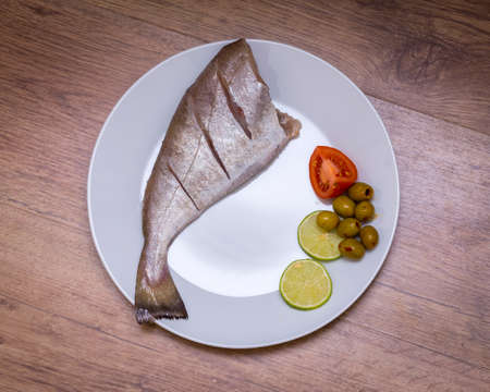 Three uncooked carcasses of the Alaska pollock without of head and tail and bundle of parsley on a white dish on a surface of old wooden planks