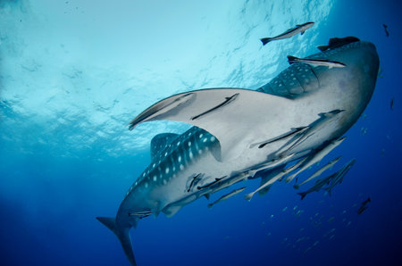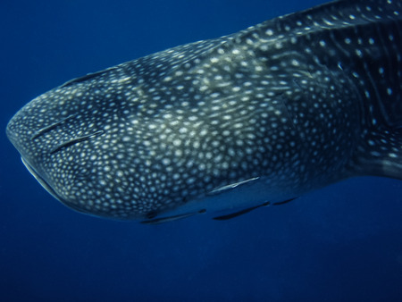 Massive whaleshark swimming in the deep with its large mouth open to feed on krill and planktons.