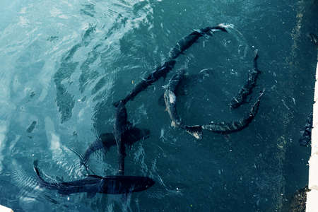 Water texture with waves and splashes from fish, Water texture, fish swimming underwater, natural natural water, sea background