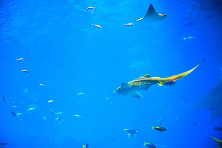 Stingray, sharks and a lot of fish swims undersea in blue ocean.