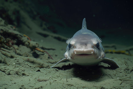 A mesmerizing close-up of a deepwater goblin shark in its natural habitat