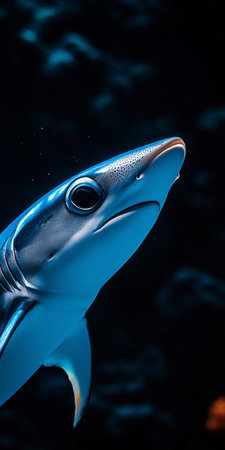 Blue Shark Portrait Under Water on Black Background, Marine Life in Dark Ocean Depths.