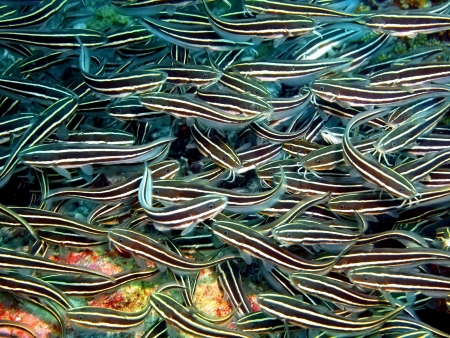 School of Striped Eel Catfish. The younger the individuals, the denser the school: from a distance it looks like a single large fish. Philippines