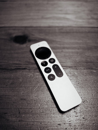 Closeup of a hand holding a tv remote control while watching shows on a Television streaming service - Desaturated filter with blurred background