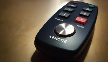 A remote control rests on a smooth surface, soft blue lighting casts gentle shadows around.