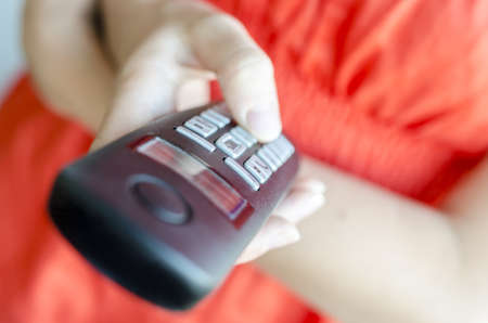Close-up of hand with the remote control television and presses the button, technology concept