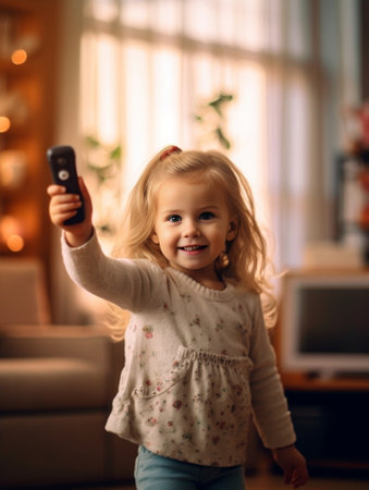 Playful little girl smiling and playing with magic wand while having video call : Generative AI