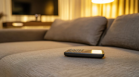 Remote sitting on an armrest of a fabric sofa with soft indoor lighting in the background