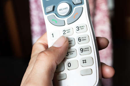 Detail of woman dialing phone number on black portable telephone handset.