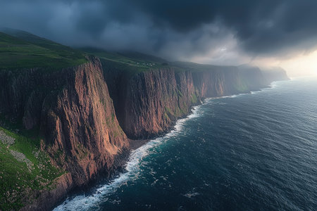 Generative AI : Aerial view of agitated atlantic north sea near rock cliff Faroe island