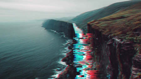 This abstract image features a scenic cliffside view merged with digital glitch elements. The design captures the ocean's beauty while presenting a modern artistic interpretation.