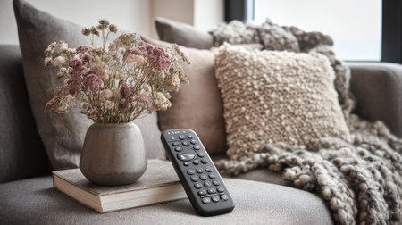 A serene living room scene showcasing a remote control resting beside a vase of dried flowers, a textured pillow, and a cozy blanket on a stylish sofa, evoking warmth and relaxation.