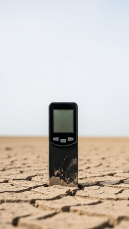 A vertical (9:16) full-body shot of a modern, empty digital rainwater gauge collector sitting in sev