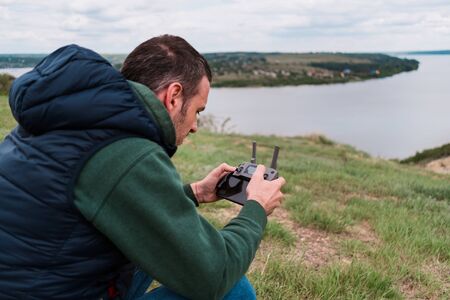 Man holds remote controller with his hands and controls the drone. New technologies and innovations concept.