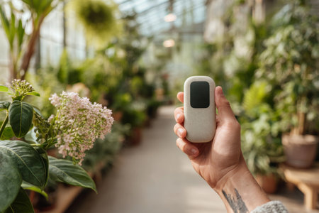Person holds a compact AI assistant device in a greenhouse full of houseplants