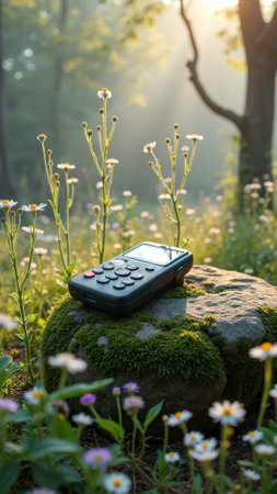 Remote control on mossy rocks in sunlit forest clearing with wildflowers. That the image is generated using AI.