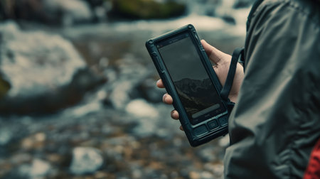Mockup image of smart phone with black blank screen template, hand holding and showing mobile in nature outdoor.
