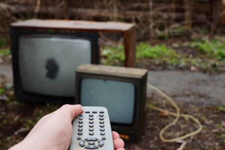 Old tv and remote control in the hand on the street