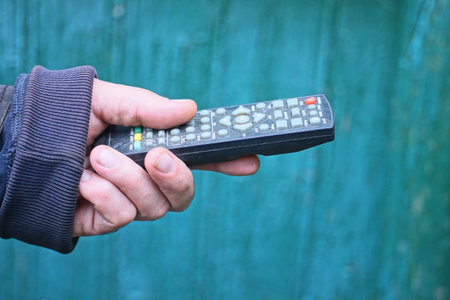 male hand keeps remote control press the button selective focus