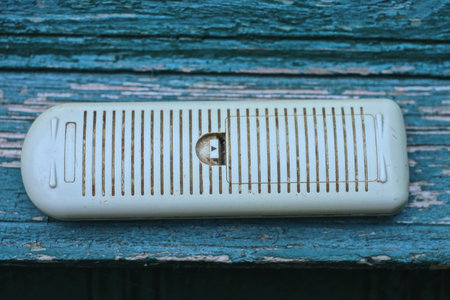 hand holding one old black plastic TV remote control against the backdrop of a green wall on a city street